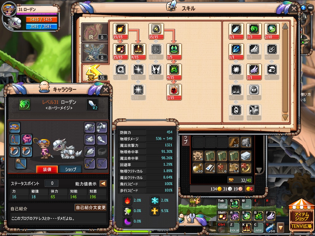 どうもお久しぶりです。こんちわ! ここ3週間ぐらい毎日教習所に行ってるんですが、平均で一日3~4時間ぐらいしか向こうで過ごしていないので、ここを更新できなかったのはテンションの低下がきっと原因です。 家にいる時間はずっとパソコンに向かってるんですが、こないだ紹介したTENVIをやってることが多いです。 (気付けばLv31 経験値効率27%/hぐらいの強さに・・・) いやー。ゲームって怖いですね(笑。 (メ-_-)=○)゜O゜);'.、 ↓一応、ステ公開。クリックで拡大![]()