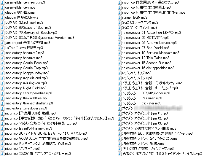 PSPを買ってから、学校でも作業用BGMを聞きながらレポートなどの作成ができるようになって、ずいぶん効率が上がりました。 正確に測ってないけど、20~40%ぐらい早くできるようになってる気がします。 PSP用の2GBのメモリースティックPro買ったけど、作業用BGMで500MB、他で100MBぐらいしか使ってないから、結局1GBのでもよかったかもしれないなぁ。 ↓作業用BGMとしてPSPで持ち歩いてる曲ゲームの曲ばっかりだなぁ・・・(-_-; ※ニコニコ動画から取ったものは、動画のタイトルをそのままつけてます。